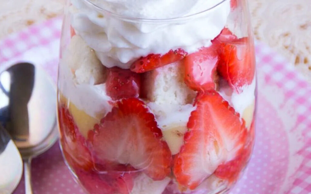 - Next, spread a generous layer of whipped cream over the strawberries. Repeat these layers until you reach the top of the trifle dish, finishing with a layer of whipped cream.